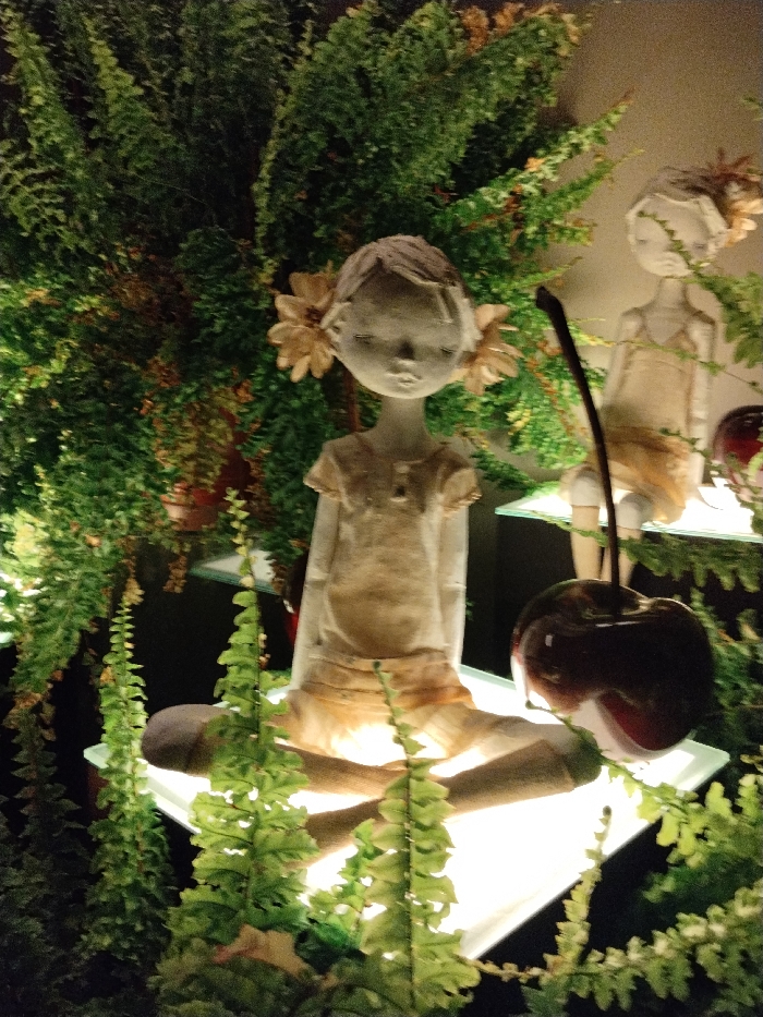A ceramic doll sits cross-legged on a lighted surface, surrounded by ferns and greenery. The doll has flowers at its ears. A second doll stands on a shelf behind the first doll. A large, shiny cherry with a long stem sits beside the first doll. The lighting in the image casts a soft glow on the dolls and plants, creating a whimsical and slightly surreal atmosphere.