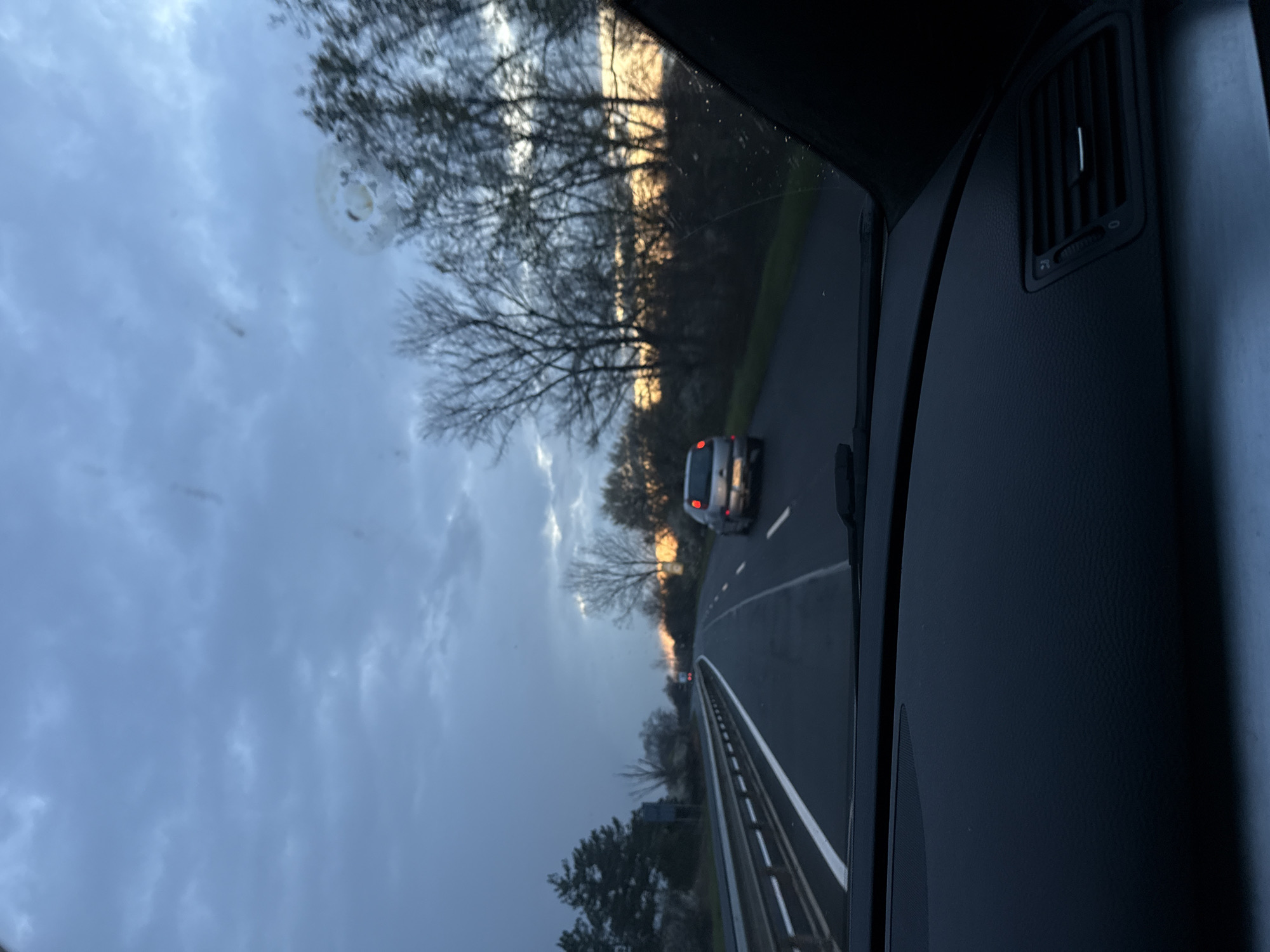 The image depicts a view from inside a car, looking out the driver's side window onto a road with another car ahead. The sky is overcast with patches of golden light near the horizon. Trees line the roadside. The car's interior is visible on the right side of the frame, featuring an air vent. The location is not determinable as Chernomorets, Bulgaria from the image.