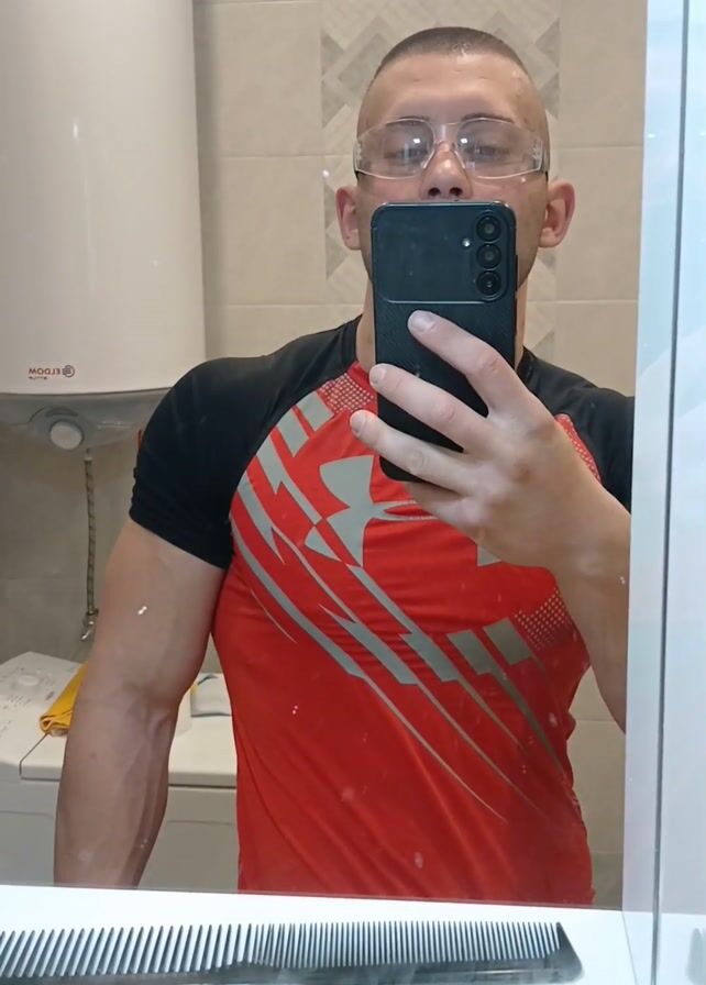 A man takes a selfie in a bathroom mirror. He is wearing safety glasses and a red and black t-shirt with a stylized pattern. He is holding a black smartphone in his right hand, partially obscuring his face. His left arm is flexed to show off his bicep and visible veins. In the reflection, a white water heater hangs on the wall above a washing machine. The bathroom is tiled with a geometric pattern. A white sink counter is visible beneath the mirror, with two black combs resting on it. To the left are toothbrushes in a holder and a container of lotion or soap.