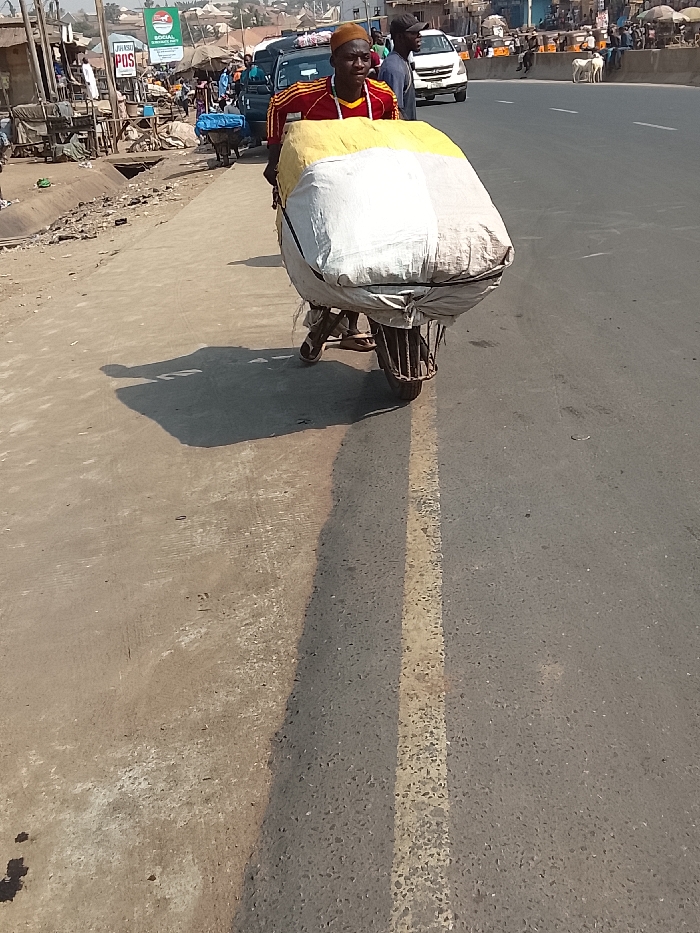 - "An adult male, wearing a red and yellow striped short-sleeved shirt, a light brown cap, and flip-flops, is actively pushing a heavily loaded three-wheeled handcart on a paved road in Masaka, Nigeria" by FM-LIDYd2, licensed under CC BY 4.0