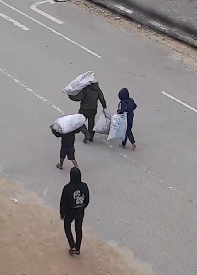 high-angle view of a street scene. Initially, four individuals are walking along the road, carrying large bags. Three of them are visibly burdened by the bags, which appear heavy and bulky. They are dressed in casual attire, including hoodies. As the camera angle changes, a fifth person is seen walking ahead, apparently separate from the group of four. The background reveals a building with arched windows on one side of the street, and on the other side, a wide area is visible, filled with what appears to be temporary shelters or tents. Overhead power lines are visible, adding to the urban setting.