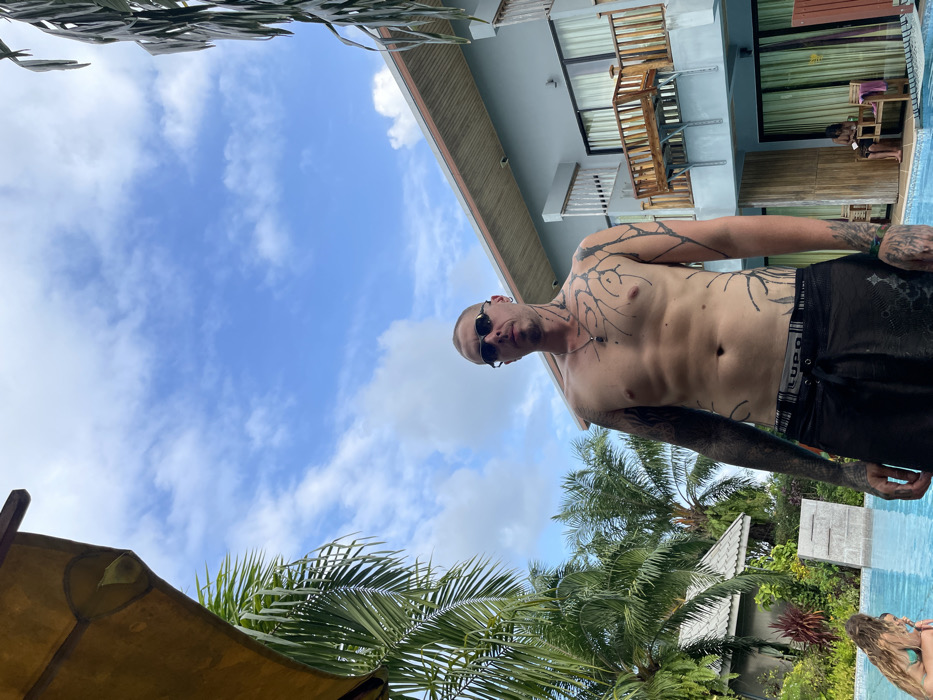 This image depicts an outdoor scene in the City of Ban Tha Muang, Thailand. A male individual stands centrally in the foreground, facing the camera. He has short, light-colored hair, wears dark sunglasses, and a dark pendant on a chain around his neck. His body is extensively tattooed with black ink, including full sleeves on both arms and abstract, tree-like patterns covering his chest, torso, and extending up his neck. He wears dark swim shorts, with a visible grey waistband bearing the "LUPO" logo. Behind the male subject is a swimming pool. To the lower left, a second individual with long, light-brown hair, wearing a turquoise bikini top, is partially visible at the edge of the pool. In the background, a light-blue multi-story building, likely a hotel or guesthouse, features a wooden balcony on its second floor and visible windows. A third individual is seated on a wooden bench on the ground-level patio of this building, appearing to interact with a handheld device. The environment is rich with green palm trees and other tropical foliage, under a clear blue sky with scattered white clouds. A partial view of a yellow fabric awning is visible in the upper left corner of the frame.