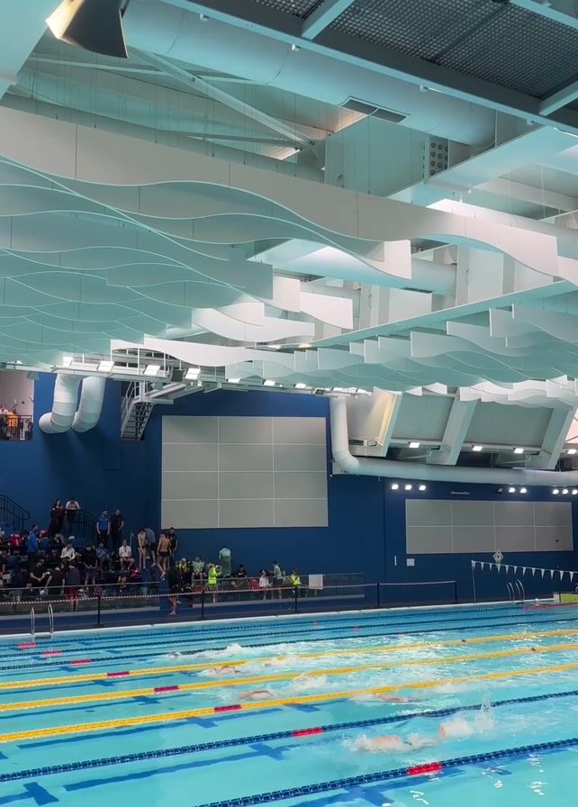 swimming competition taking place in an indoor pool. There are multiple swimmers in different lanes, swimming freestyle. Spectators are sitting in the bleachers on one side of the pool, watching the race. The pool has bright blue water, and yellow and red lane markers. The ceiling is high with a unique, wavy design. There are air conditioning ducts and speakers visible on the ceiling. The walls are painted a deep blue. The camera is positioned to capture a wide view of the pool and the spectators.
