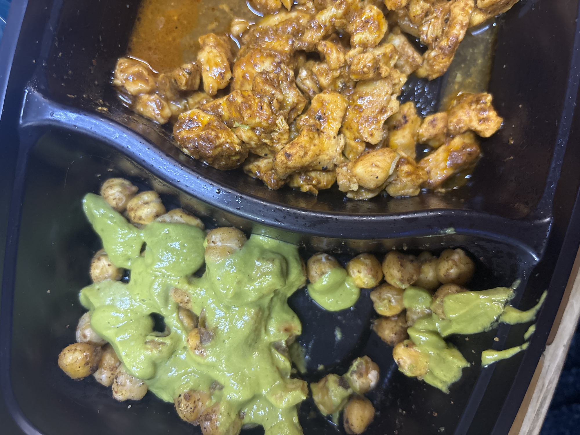 A close-up, overhead view depicts a prepared meal contained within a black, two-compartment plastic container
