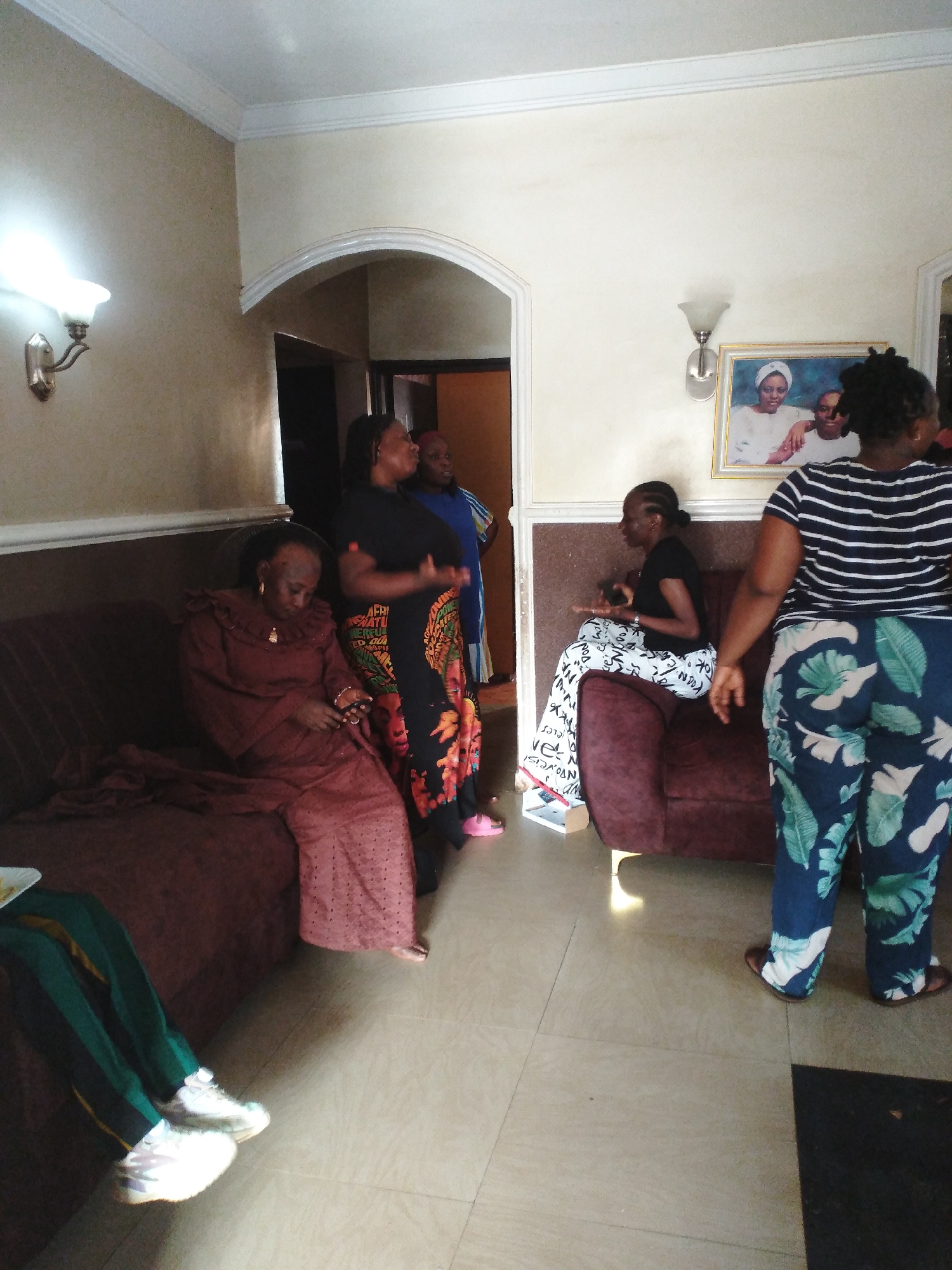 The image depicts an interior scene likely in a home in Karu, Nigeria. Five women are visible. One is seated on a brown couch, looking at a phone. Another woman stands beside the couch, gesturing with her hands while talking. A third woman is seated in a brown chair, facing the gesturing woman. Another woman, wearing a striped top and floral pants, is standing with her back to the camera. In the background, a woman in blue stands in a doorway. The room is furnished with a brown couch and chair. A framed picture is hanging on the wall. There are tiled floors. A partial view of someone's legs and shoes is visible in the lower left corner.