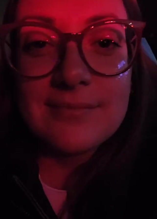 close-up of a person's face illuminated by a red light. The person is wearing glasses and has glitter makeup on their cheek. They are wearing a dark jacket and a white shirt underneath. The background is dark. The person is looking at the camera and appears to be smiling slightly.