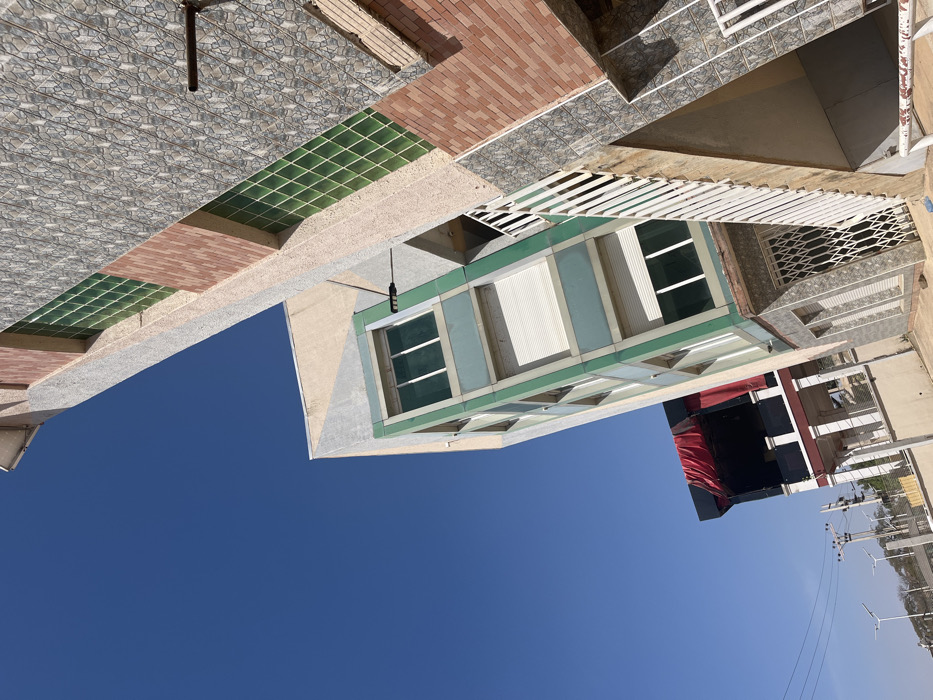 The image displays an urban scene in Jos, Nigeria, under a clear blue sky, captured with a tilted perspective. In the foreground and to the right, a multi-story building features a composite facade. Its exterior includes sections of grey patterned tiles, reddish-brown brickwork, and recessed areas containing green glass block windows. White vertical railings are present, and a white metal lattice security gate secures a ground-level opening. Adjacent to this, positioned to the left and slightly behind, stands another multi-story building. This structure presents a modern facade primarily composed of light green and light blue-grey paneling. It is characterized by multiple rectangular windows, some fitted with white roll-down shutters, while others are open, revealing dark interior spaces. The uppermost section of this building is light beige with geometric patterns, and a black exterior light fixture is mounted on its side. Further in the background to the left, a smaller two-story building is visible. Its lower level includes white pillars and railings, while the upper section is dark-colored and partially covered by a large red fabric or tarp. The far left background reveals utility poles supporting overhead lines, multiple contemporary streetlights, and a fence bordering a distant area with sparse vegetation. The sky is uniformly clear and blue, devoid of clouds. No individuals or vehicles are discernible within the frame.