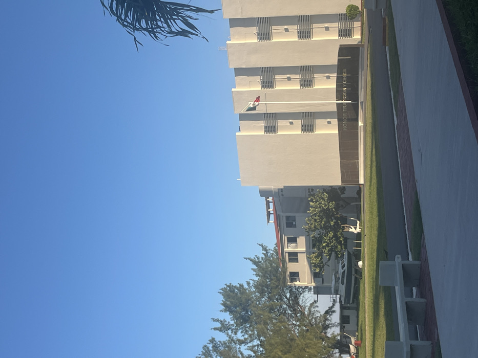 The image depicts an exterior view of the Heroica Escuela Naval Militar in Antón Lizardo, Veracruz City, Mexico, under a clear blue sky. In the foreground, a concrete walkway extends from the bottom of the frame, with two light-colored concrete benches positioned on the left. Beyond the walkway, a strip of dark pavement precedes a manicured green lawn. Dominating the midground on the right is a multi-story, light-colored building featuring prominent horizontal louvers on its facade. A white flagpole in front of this building flies a Mexican flag at half-mast. Below the flagpole, a dark, low-rise monument displays the motto "HONOR TRADICIÓN Y CIENCIA" in light-colored text. To the left, across the lawn, several tall, needle-leafed trees are visible, behind which a multi-story building with a red roof is partially obscured. On the grass in the center-left, a white and blue powerboat is resting on support structures, apparently out of the water. A smaller white boat or dinghy is also visible further left near the edge of the campus. Various green shrubs and trees are scattered throughout the scene. A palm frond is partially visible in the upper right corner of the frame. The scene is brightly illuminated by natural sunlight, casting shadows that suggest morning. No individuals are present in the image.