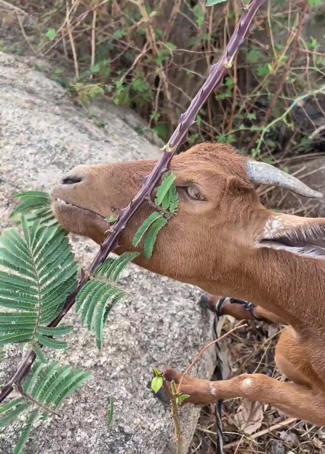 brown goat eating leaves from a thorny branch