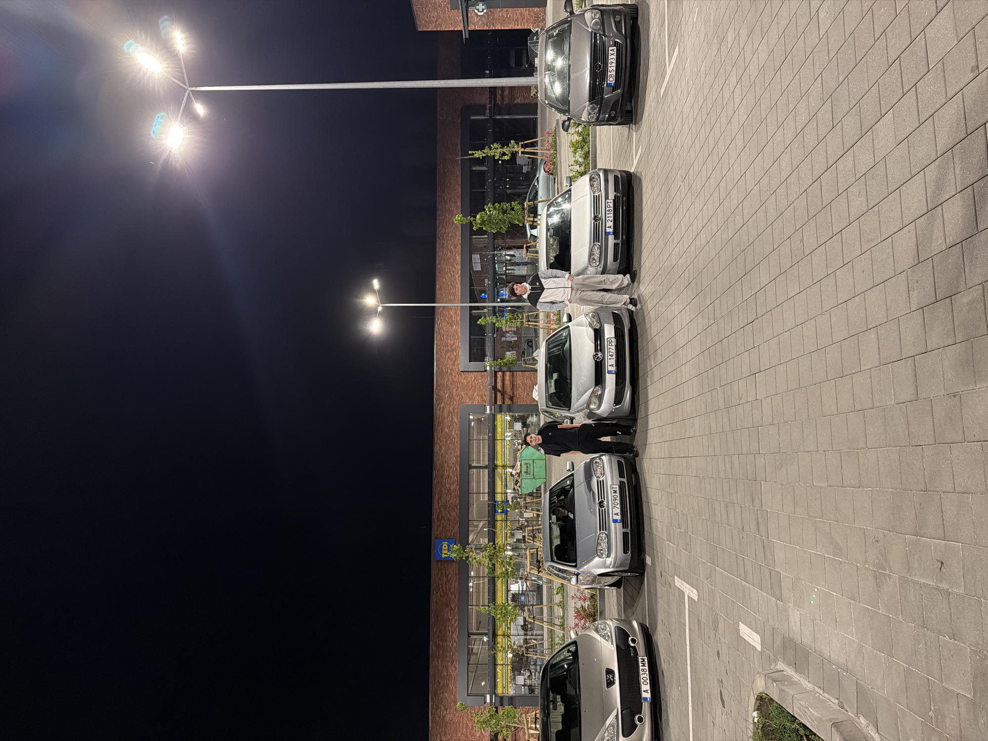 At night, a parking lot in Burgas, Bulgaria, is lit by overhead street lights. Five cars are parked in a row near a brick building with glass windows and the word "TEDi" displayed. Two individuals are standing between two cars, one wearing a white tracksuit and the other in all black. The license plates on the cars appear to be Bulgarian. The parking lot is paved with grey brick.