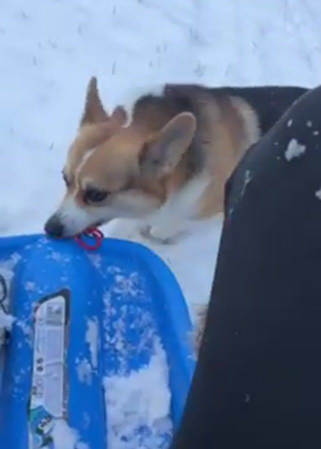 person sitting on a blue sled in the snow. A corgi dog stands next to the sled, gently pulling on the red rope attached to the sled. The dog is brown, white, and black. The person is wearing black pants and snow boots. The sled has a product label on it. The background is a snowy field. The camera appears to be mounted on the sled, showing a first-person perspective.