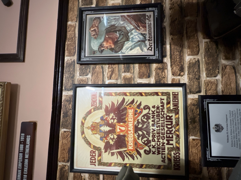 The image showcases various framed historical items mounted on a brick-patterned wall. One frame contains a poster of a soldier and the title "Der Leutnant". Below it, another frame holds a German war bond advertisement ("Kriegsanleihe") with an eagle emblem and the words "Jeder zeichne Kriegsanleihe!" Also visible is a frame with biographical information on Wilhelm II, the German Emperor, and a plaque about the German Emperor from 1888 to 1918 who was exiled in the Netherlands.