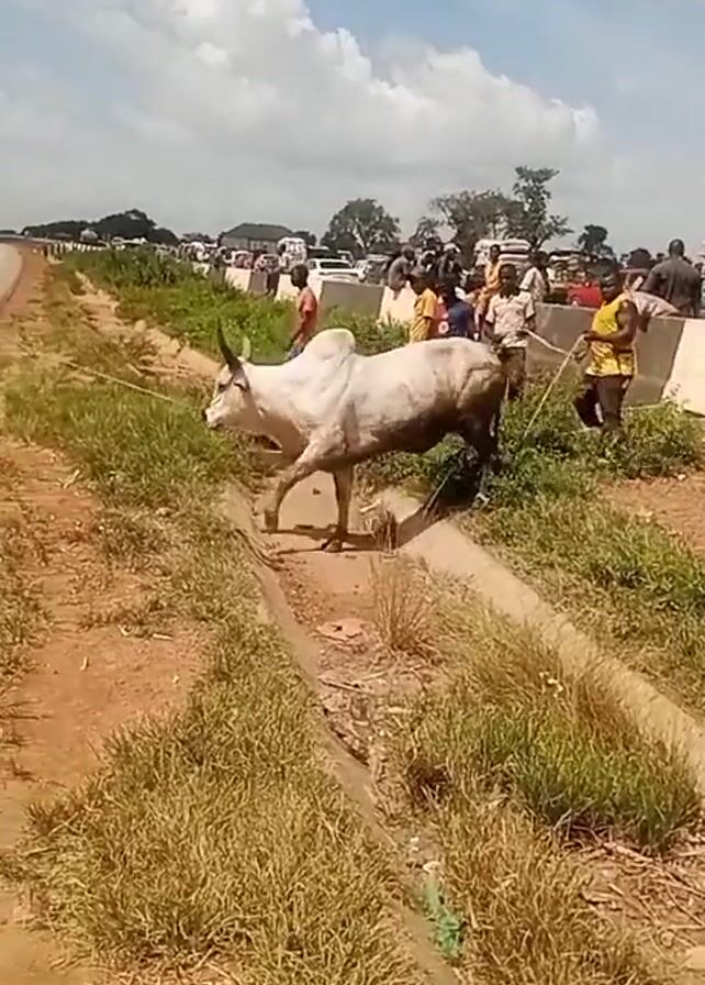 large, mostly white bull, being led away from a road by a group of men. The bull is being pulled by a rope tied around its tail. The bull is on the side of the road, in a narrow ditch and then steps onto the shoulder of the road. A group of people stand by the roadside, watching. There are cars and trucks on the road. The day is sunny, with fluffy white clouds. The environment is grassy, and somewhat dry.