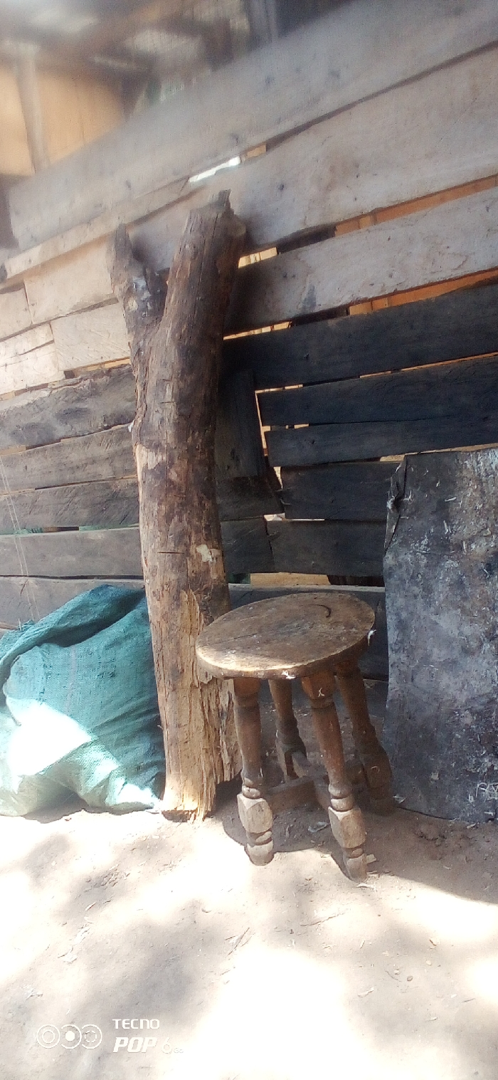 The image depicts an outdoor or semi-enclosed area within Mahiakalo ward, Kenya. A weathered wooden stool with a round seat and three turned legs stands prominently in the lower right quadrant, resting on packed earth ground. To its left, a vertical, rough-hewn wooden post or tree trunk, exhibiting stripped bark and natural texture, serves as a support. Behind the post and to the left, a crumpled teal-green tarp or large sack is present on the ground. The background is a wall constructed from horizontally oriented wooden planks of varying widths and shades, some with visible gaps. Strong sunlight illuminates parts of the scene, casting distinct shadows on the ground and reflecting off the tarp. No human figures are present.