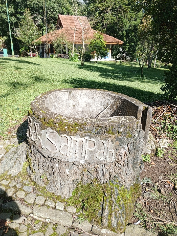 An outdoor scene features a rustic, moss-covered trash receptacle with "Sampah" inscribed on its side