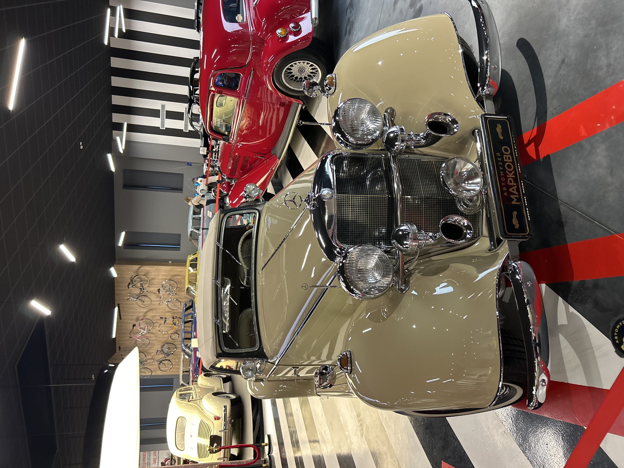 The image depicts the interior of the Auto Museum in Markovo, Bulgaria, showcasing a collection of vintage vehicles. In the foreground, positioned centrally, is a tan/beige vintage Mercedes-Benz convertible, oriented towards the viewer. It features a prominent chrome grille, circular headlights, and front bumper, with a black and gold license plate reading "АВТОМУЗЕЙ МАРКОВО" (Auto Museum Markovo) affixed below the bumper. Red and white striped markings on the grey floor are visible around this vehicle. Behind the tan convertible and to its right, a bright red vintage coupe with chrome accents and aftermarket multi-spoke wheels is displayed. To the far left, the rear of a cream-colored vintage car, possibly a Renault 4CV with a distinctive ridged engine cover, is partially visible, separated by red velvet ropes on stanchions. Further into the background, several other vintage cars in various colors (including blue, yellow, black, and grey) are parked. One individual, appearing to be an adult female with light hair and wearing a light-colored jacket, is visible in the mid-ground, standing near the grey car on the left, facing away from the camera. The museum hall features a dark grey grid ceiling with numerous linear fluorescent light fixtures. One large, oblong white light fixture hangs in the foreground ceiling. Walls are painted grey, with a section on the right adorned with a bold black and white vertical stripe pattern. Another wall section on the left displays multiple bicycles mounted as exhibits.