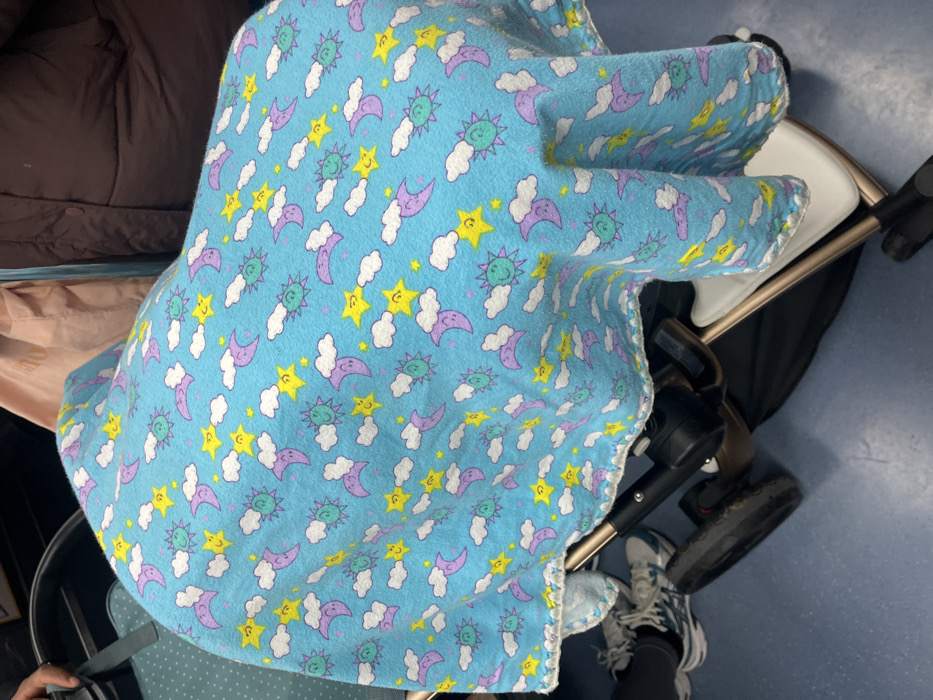 A baby stroller is partially covered with a light blue blanket featuring a repeating pattern of stars, moons, clouds, and suns