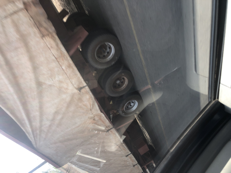 The image displays a partial view of a heavy-duty cargo truck on an asphalt road in Umuokpu, Nigeria, observed from the interior of another vehicle. The truck's trailer is covered by a soiled, light beige or off-white canvas tarp exhibiting prominent wrinkles and dark stains. The visible undercarriage and frame components are dark reddish-brown. Three sets of wheels are discernible on the trailer, all equipped with dark tires. The rearmost visible wheel features a silver-colored rim, while the two preceding wheels have dark, possibly rusted, metallic rims. The dark gray asphalt road includes a visible yellow lane marking on its right side. The upper left background indicates a bright sky and blurred green foliage. The foreground displays the dark trim of a vehicle's window frame and reflections on the glass, consistent with an interior perspective. No individuals are discernible within the frame.