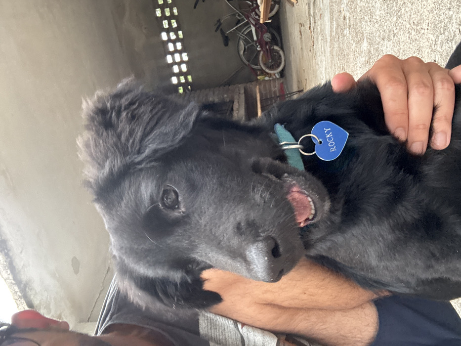 - "The image captures a black dog, identified by a blue heart-shaped tag reading "ROCKY" on its teal collar, being held by an individual in Ciudad de la Costa, Uruguay" by FM-61Xqd2, licensed under CC BY 4.0