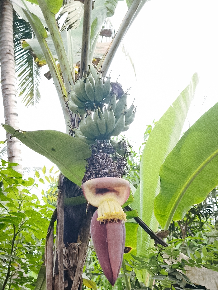 - "The image depicts a banana plant in Teumpokteungku, Indonesia, showcasing a large cluster of unripe green bananas and a prominent banana blossom" by FM-RPcK62, licensed under CC BY 4.0