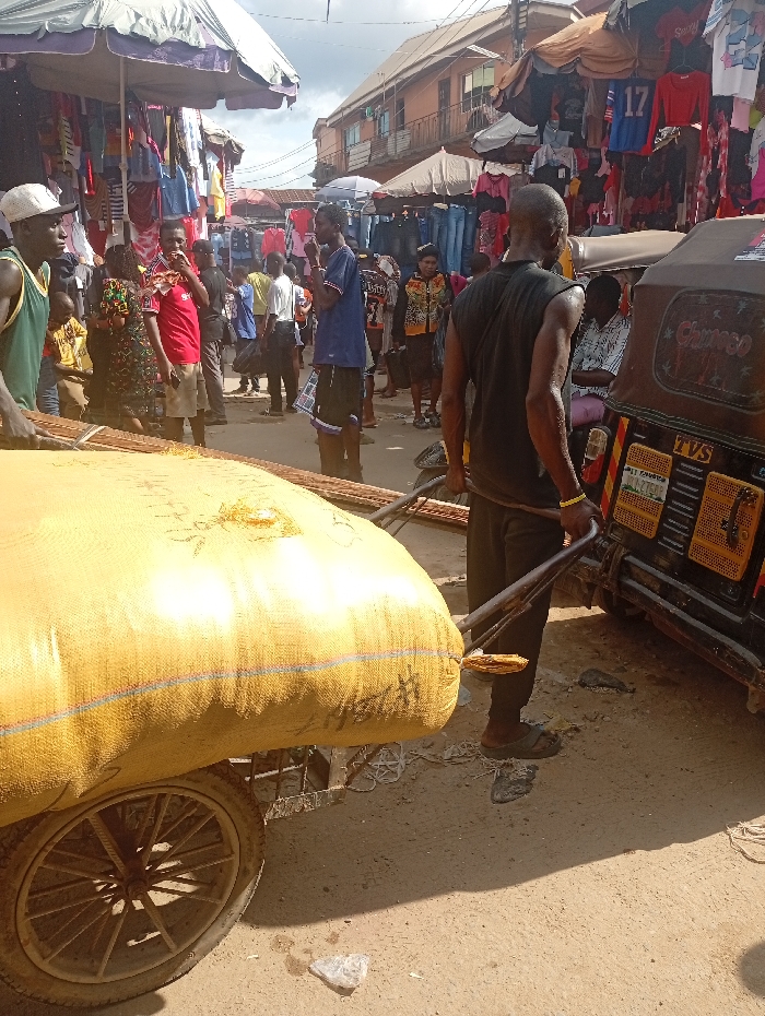 The image depicts a bustling outdoor market scene on a dirt or unpaved road in Fegge, Nigeria. In the foreground, a large, cylindrical yellow sack, possibly made of woven polypropylene, rests on a two-wheeled handcart partially visible on the left. A male subject, seen from behind, wears a black sleeveless top and dark pants with sandals, operating the handles of the handcart. To his right, the rear section of a black three-wheeled vehicle, identifiable as a "TVS" brand tricycle (keke napep), is parked or stationary. The inscription "Chiamego NWA" is visible on the vehicle's side, along with yellow and red accents. Another individual is seated within the tricycle. The midground and background reveal a crowded market street. Numerous individuals, predominantly male, are walking and standing between market stalls. On both sides of the thoroughfare, various goods, primarily clothing such as t-shirts, long-sleeved shirts, and jeans, are displayed on racks under diverse awnings and large umbrellas. Essential details include a male subject in a green tank top and white baseball cap on the left, near the handcart, and another male subject in a red t-shirt and light shorts further back. Buildings with orange-brown facades are visible above the market stalls, and overhead electrical wiring is present. The sky is partially cloudy, and sunlight casts distinct shadows on the ground, indicating midday conditions. The ground surface is rough and appears unpaved, with some scattered debris.
