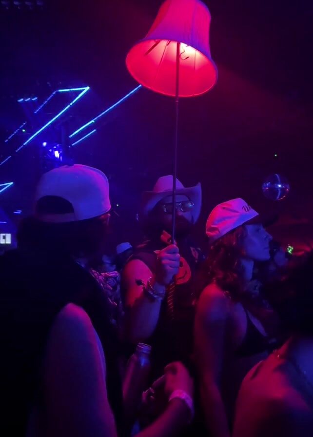 In a dimly lit nightclub with red and blue lighting, several people stand and dance. In the center, a man in a cowboy hat and sunglasses holds aloft a lamp with a pink shade, mounted on a pole. Two other people wearing baseball caps stand nearby, seemingly talking to each other. A disco ball hangs in the background, partially obscured by the crowd.