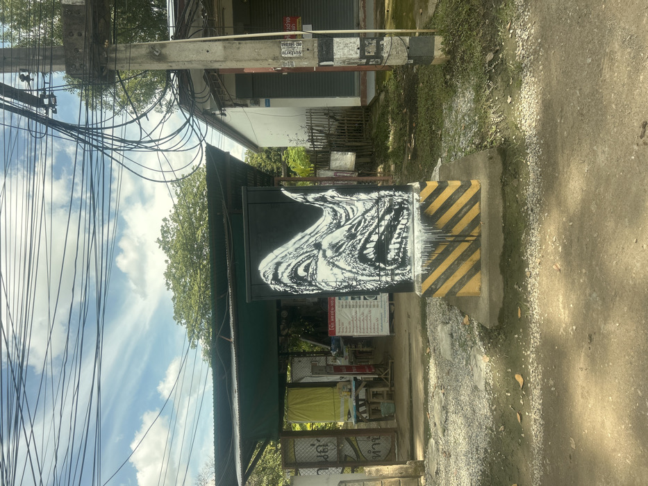 The image depicts an outdoor urban scene in Chiang Mai City Municipality, Thailand, under a partly cloudy blue sky. In the foreground, a dirt and gravel surface occupies the lower frame, with small patches of green vegetation and scattered leaves. Centrally positioned is a black utility box, approximately 1.5 meters tall, resting on a concrete base. The lower section of the box's base is painted with diagonal yellow and black stripes. The front face of the black utility box features white graffiti art depicting a distorted, stylized screaming face or open mouth with visible teeth. White paint drips vertically from the bottom edge of this artwork onto the striped base. To the left of the utility box, an open-sided structure with a dark green corrugated metal roof is visible. Inside this structure, several light-colored plastic tables and stools are arranged, suggesting an eatery. A yellow tarp or fabric is partially visible within, and a white sign with black Thai script is displayed near the entrance. To the right of the utility box, a light-colored building with closed windows or doors is partially visible, fronted by a low wooden fence. Further to the right stands a concrete utility pole, marked with black and white horizontal stripes, bearing several attached notices or stickers. Numerous tangled black electrical and communication wires crisscross the sky overhead, connecting to the utility pole and extending across the frame. Green foliage from distant trees is visible behind the structures. No individuals are present.