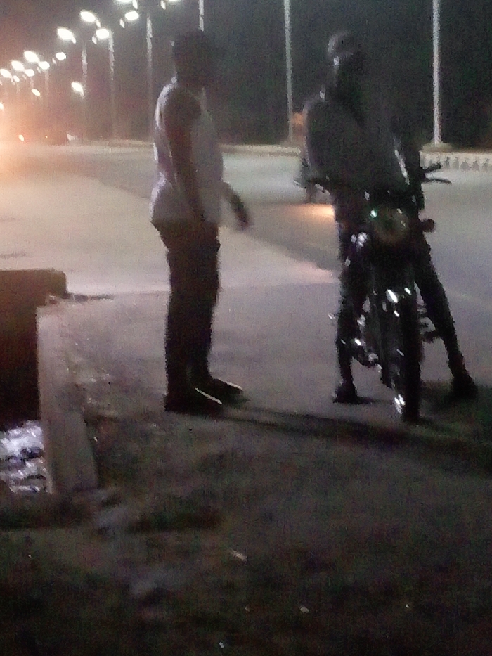 Two figures are visible at night near a roadway. One individual stands on a curb in a sleeveless shirt and dark pants. The second figure is near a motorcycle with its headlight on. Both figures are silhouetted. Streetlights illuminate the background road. The scene appears dimly lit and grainy.