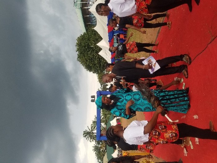 An outdoor scene in Alor, Nigeria, features a gathering under a heavily overcast, dark grey sky. A red carpet is laid over an unpaved ground surface, with scattered Nigerian Naira currency notes visible on the carpet. In the central foreground, a woman wearing a teal and black patterned gown with a matching headwrap stands, looking towards a man in a black tunic, black pants, and dark sandals, who is holding a pamphlet in his left hand. To their left, a young woman in a white t-shirt, black leggings, and a red, black, and gold patterned wrapper stands, holding a large, dark feathered object with a white handle. Another young woman, partially visible behind the central woman, appears to be bending towards the ground. In the mid-ground and background, multiple individuals, predominantly young women, are present. Many wear black tops, black leggings, and patterned red, black, and gold wrappers similar to the central young woman. Some are barefoot or wear sandals. To the right, three white canopy tents are visible. A blue archway structure is present on the left. In the far background, a multi-story building with a light green roof is discernible on the right, alongside various trees and green foliage, including palm trees. The overall atmosphere suggests an ongoing event or ceremony.
