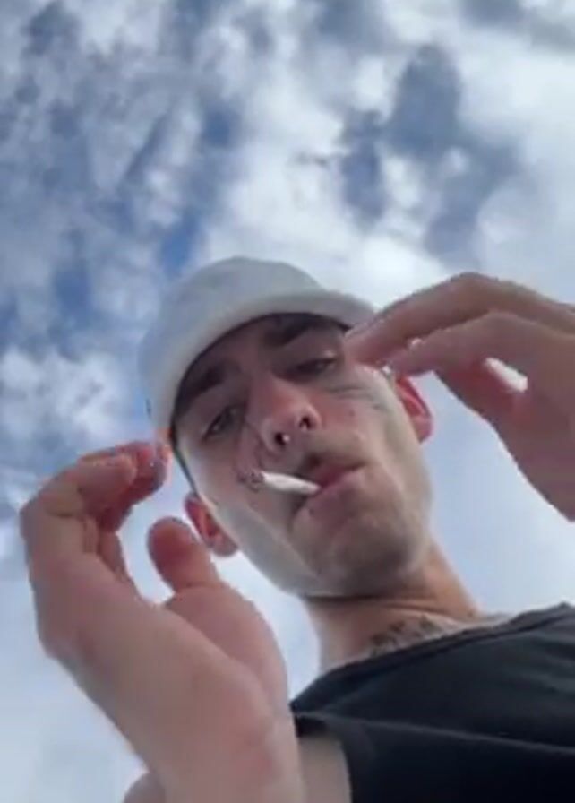 The video features a young man with face tattoos, a nose ring, and a white baseball cap, wearing a black tank top. He is holding a cigarette in his mouth and exhales smoke directly toward the camera. The camera angle is low, looking up at the man against a cloudy sky. He briefly looks around.