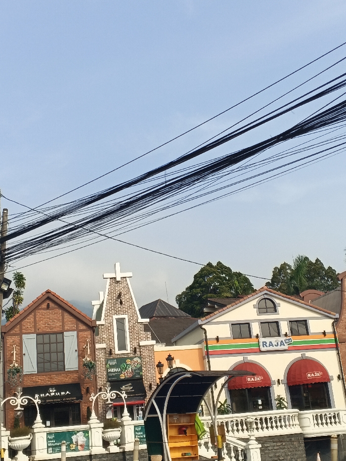 The image depicts a commercial street scene under a clear blue sky, presumably located in the city of Unknown, Cambodia. A dense cluster of black utility cables and wires spans diagonally across the upper portion of the frame, originating from a utility pole on the far left. Three distinct multi-story buildings, designed with European architectural elements, are visible in the midground. From left to right: 1. A two-story building with a brown-red brick facade and a gabled roof. The upper floor features a large dark-paned window framed by light blue shutters. The ground floor displays a dark awning over an entrance, with signage reading "SHA-RA-RA" and additional text in a non-English script, likely advertising "Minuman dan Makanan." Decorative white hanging planters flank the window. 2. A taller, narrower building featuring a lighter brown brick facade with a prominent white stepped gable at the roofline, topped by a cross-like finial. A tall, narrow window is centered on the upper facade. Below it, a black vertical sign displays "MENU" and images of food or beverages. 3. A building with a cream-colored facade and a gabled roof, featuring dark-framed windows on the upper floor. The ground floor has two arched entrances, each covered by a red semi-circular awning. Signage above these awnings reads "RAJA" next to a logo resembling "7 Eleven." A horizontal decorative band with green, orange, red, and grey stripes runs across the facade below the upper windows. In front of these buildings, a continuous white balustrade or railing system is visible, made of stone or concrete, suggesting a raised walkway or terrace. A dark blue/black arched structure with yellow shelves, possibly a small kiosk or display unit, is situated in the right foreground. Decorative white lampposts are also present along the railing. Behind the buildings, green foliage and trees are visible against a lighter, more distant sky or hazy background, hinting at terrain or additional development. No individuals are present within the frame.