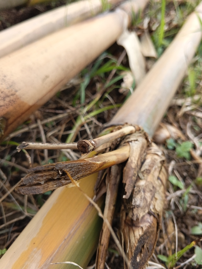 - "A close-up captures the base of a felled bamboo stalk lying on the ground amid dried leaves and sprouting green grass" by FM-HtHvC2, licensed under CC BY 4.0