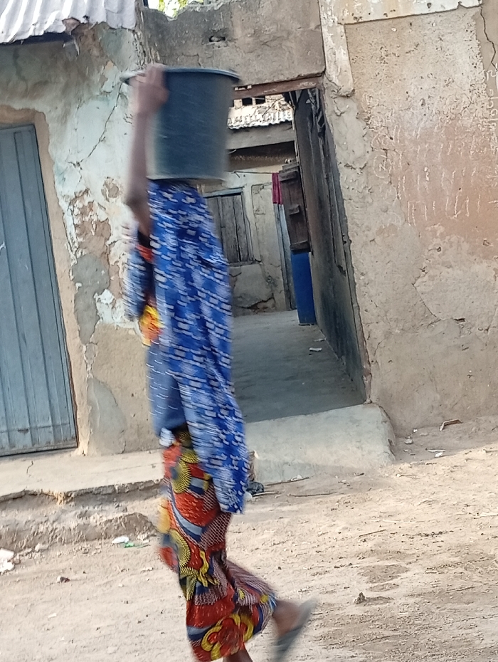An individual is depicted walking right to left on an unpaved, light brown dirt road in Gwagwarwa, Nigeria. The person, whose face is obscured by a dark grey plastic bucket balanced on their head and supported by a raised right arm, wears a blue and white patterned long-sleeved top over a vibrant, multi-colored (red, orange, yellow, blue) patterned skirt or wrapper. Dark sandals are visible on their feet, with motion blur indicating movement. The background consists of several aged, light-colored (tan/beige) concrete or mud-plastered buildings displaying visible wear, cracks, and texture. To the immediate left, a light grey metal door is set into a wall. Further back and to the right, a shadowed entryway reveals a dark wooden door and a blue barrel. Clothes, including a reddish garment, are hanging in a recessed area between structures. Corrugated metal roofing is visible above some of the building elements. The ground near the buildings shows raised concrete edges and minor debris.