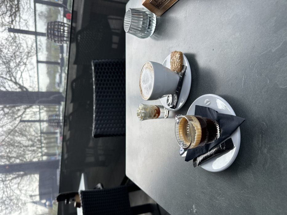 The image depicts a café table setting in Ohé en Laak, Netherlands, under overcast daylight conditions