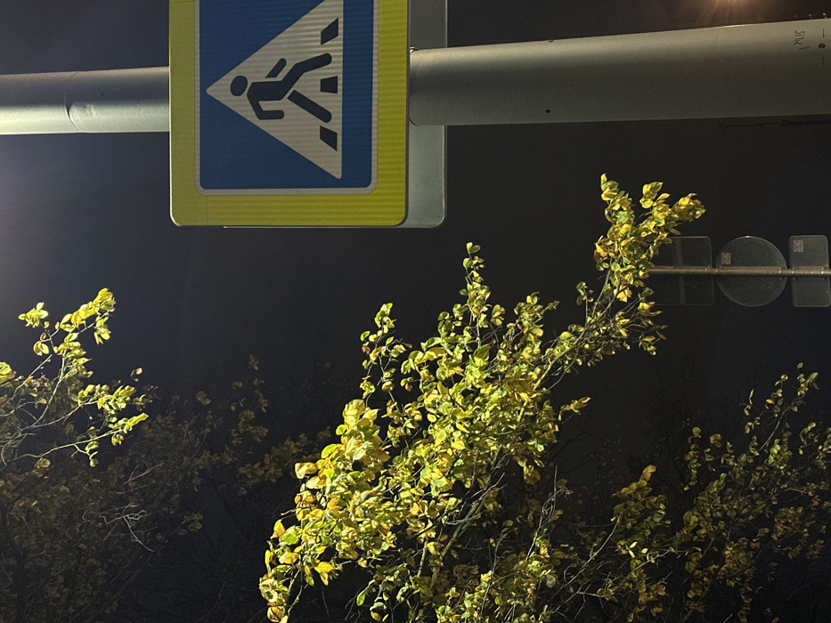 The image depicts an urban outdoor scene at night in Moscow, Russia. A Russian pedestrian crossing sign (standard road sign 5.19.1/5.19.2) is positioned on the right, featuring a blue square with a white reflective triangular insert displaying a black pedestrian figure on four black horizontal stripes. The sign is framed by a broad, reflective yellow border and mounted on a tall, light-grey metal street pole. Below the pedestrian sign, a secondary, narrower dark-grey pole supports two circular traffic signs, whose specific details are indiscernible. To the left, a significant portion of a tree with branches covered in green and yellow autumn leaves is brightly illuminated, contrasting sharply with the dark, unlit background. No individuals or vehicles are present. Faint markings, possibly "МЦД" (Moscow Central Diameters), are visible on the lower section of the main street pole, indicating the general location.