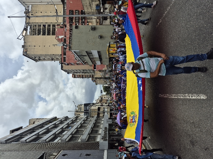 - "A crowd marches down a city street carrying a large Venezuelan flag" by FM-I4ANH3, licensed under CC BY 4.0