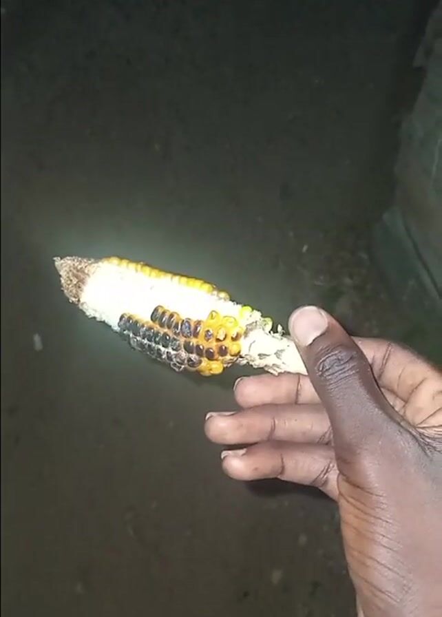 A dark-skinned hand holds an ear of corn, partly eaten. Some kernels are yellow, others are black. The background is dark and out of focus, with a hint of a wall or structure on the right. The hand rotates the corn to show different angles.