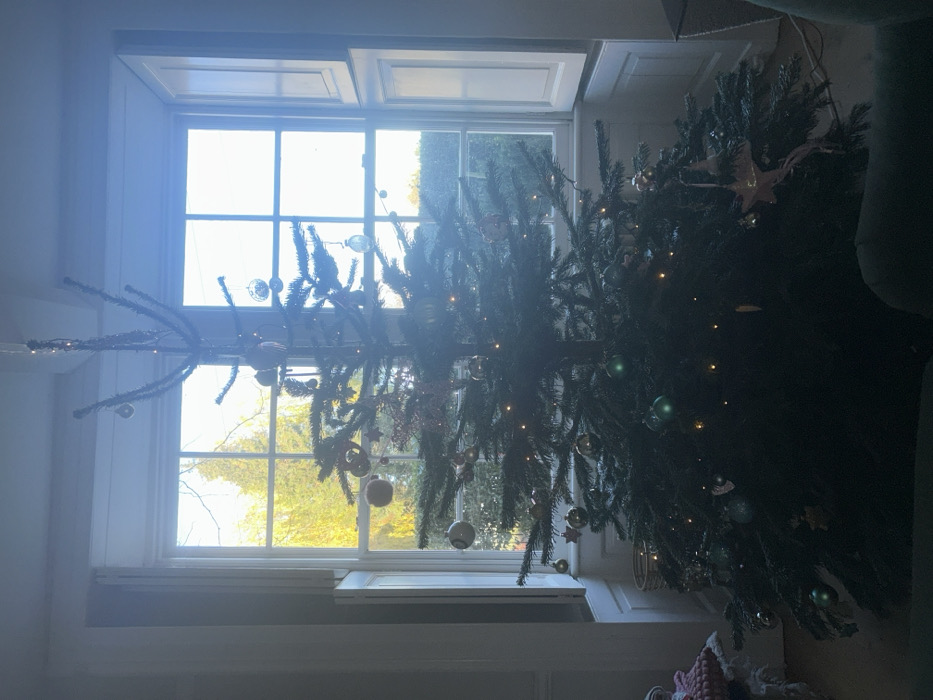 The image depicts an indoor setting within a residence in Bristol, United Kingdom. A dark green Christmas tree, decorated with fairy lights and various ornaments including gold, silver, bronze, and teal baubles, stands centrally in the foreground. Several star-shaped or intricate decorations are also visible on the tree. The tree is positioned directly in front of a large, multi-paned white window, which is flanked by partially open white wooden internal shutters on both the left and right sides. Strong daylight streams through the window, backlighting the scene. Through the upper left panes of the window, a large tree with yellow or autumnal foliage is visible. Through the lower right panes, green shrubbery or a hedge is discernible. The interior walls appear light-colored. In the lower left foreground, indistinct light-colored objects, possibly stacked textiles or cushions, are present. A dark, upholstered object, consistent with a piece of furniture like an armchair, is partially visible in the lower right foreground. No individuals are present within the frame.