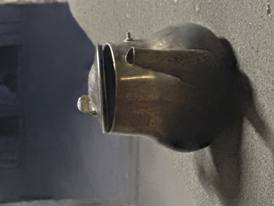 - "A solitary, aged metallic teapot, characterized by its rounded body and a prominent spout extending to the right, rests on a coarse, light gray granular surface" by FM-Vg5R62, licensed under CC BY 4.0