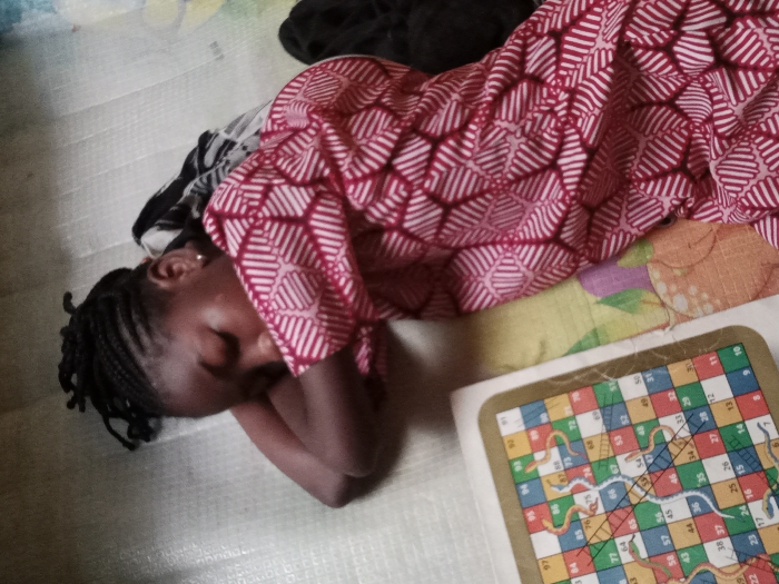 A young girl with braided hair lies sleeping on a mattress with a patterned red and white shirt. Her head rests on her folded arms, eyes closed. Beside her is a game board, possibly Snakes and Ladders, with a grid of numbered squares and winding paths. Other bedding, including a black garment, is visible. The scene suggests a moment of rest during playtime.