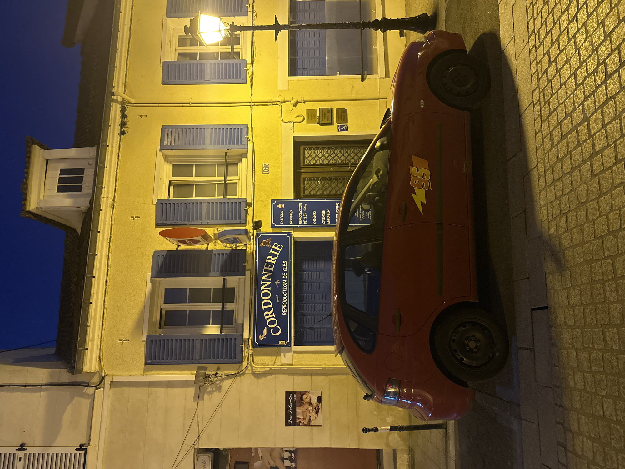This image shows a street scene in Palaiseau, France, at night. A light-yellow building with multiple blue-shuttered windows occupies the left side of the frame. At the street level, there are signs for "CORDONNERIE REPRODUCTION DE CLES" (a shoe repair and key duplication shop) and a poster advertising "Rose Relaxation No:161." Above the door of the building, the number "163" is visible. A red car with the number "95" on its side is parked in front of the building, partially obstructing the view of the shop signs. The street is paved with cobblestones. The sky is a dark blue.