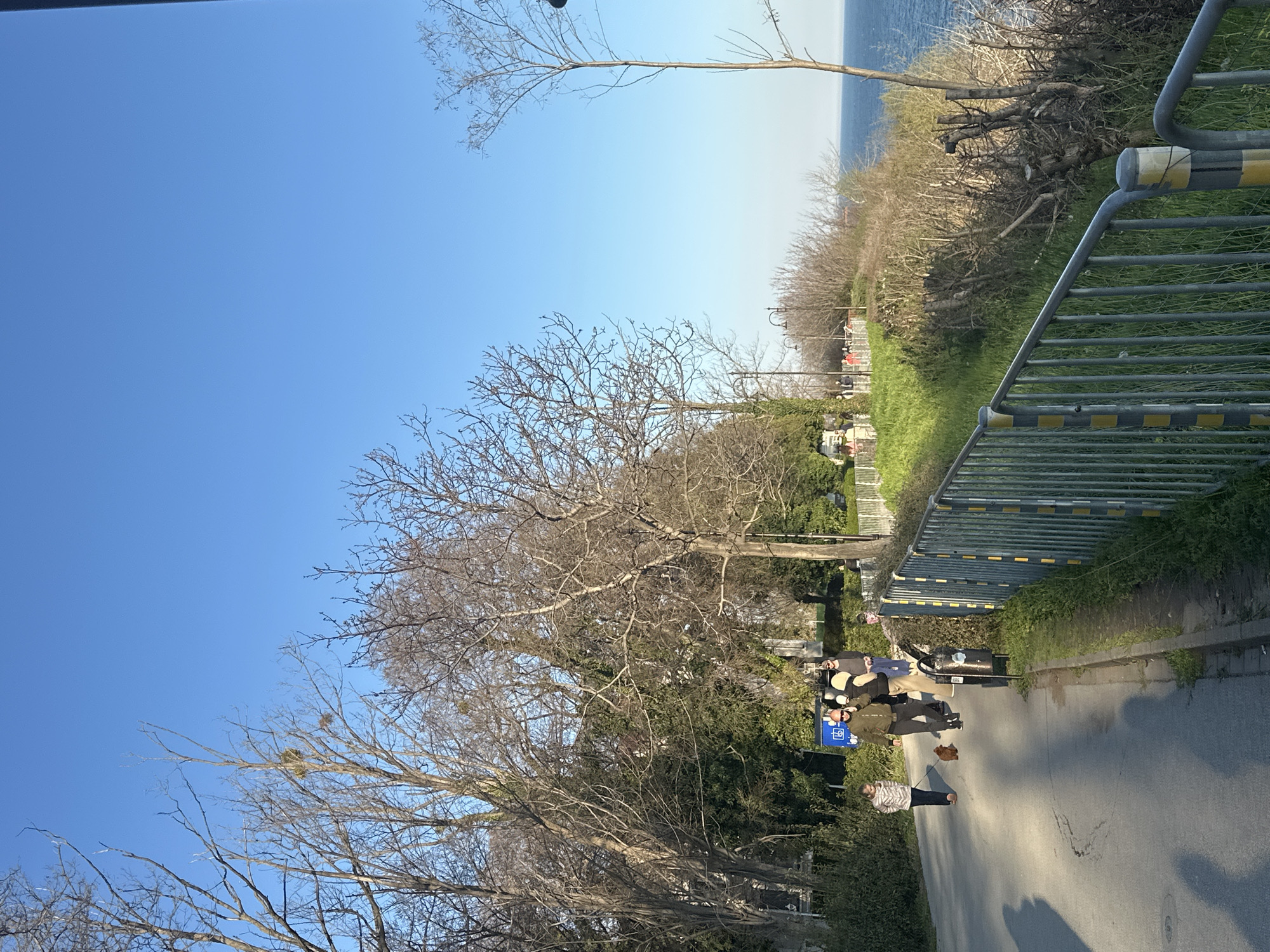 street scene in Varna, Bulgaria, on a sunny day with a clear blue sky. In the distance, the Black Sea can be seen. Bare trees line the street, and there is green grass and shrubbery on one side, near a metal fence. A sidewalk is present next to the asphalt street. Several people are walking on the street. One woman is walking a small brown dog on a leash. A group of people are standing and interacting by what appears to be a tour map.