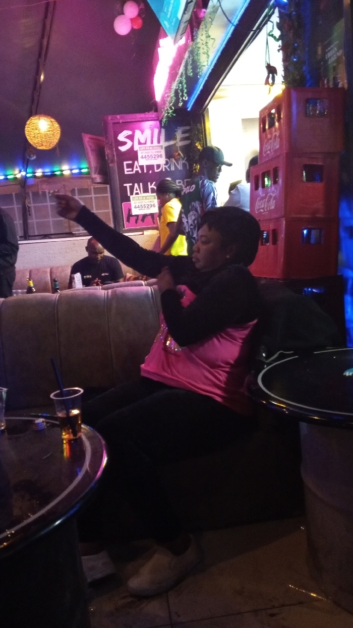 Inside a bar, a woman in a pink shirt and black pants sits on a couch with her arm outstretched, pointing. There is a drink on a table beside her. Other patrons are milling around in the background. The bar is dimly lit with colorful neon lights. A sign reads "Smile Eat, Drink, Talk." Coca-Cola crates are stacked near an open doorway.