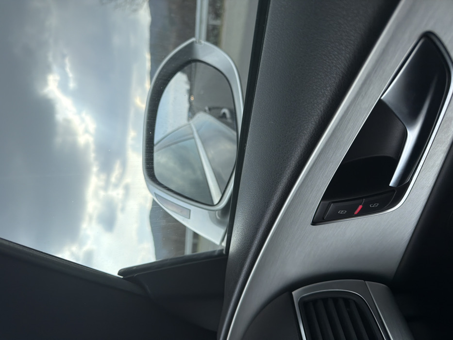 The image displays an interior perspective from the passenger side of a moving vehicle, specifically in Studena, Bulgaria. In the immediate foreground, a dark grey textured door panel with a brushed metallic trim is visible, featuring a dark grey door handle and a control module with two lock/unlock buttons. The upper button exhibits a red illuminated indicator, signifying a locked state. To the left, a portion of a dark grey air vent with horizontal slats is present. Through the vehicle's side window and reflected in its silver exterior side mirror, an overcast sky with patches of bright light is visible above a distant landscape of hills or mountains. The mirror's surface appears speckled, and its reflection shows a segment of the vehicle's silver body and a view of a multi-lane roadway extending into the distance, bordered by a metallic guardrail on the right. Distant vehicle lights or streetlights are faintly discernible on the road.