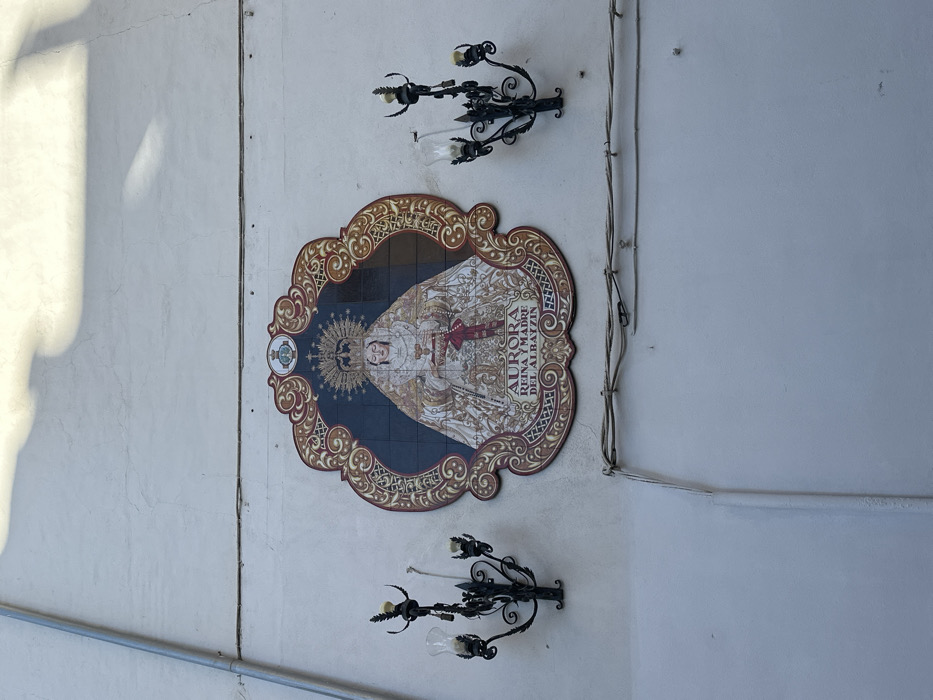 An ornate ceramic tile depicting the Virgin Mary, titled "AURORA REINA Y MADRE DEL ALBAYZIN" (Aurora, Queen and Mother of the Albayzín), is mounted on a textured, off-white stucco wall