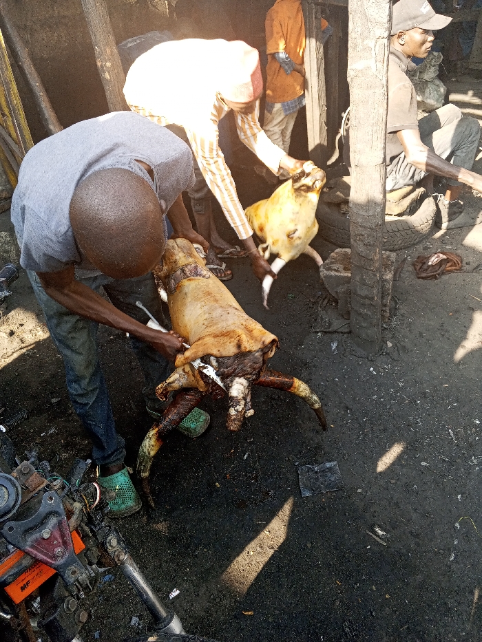 - "In an outdoor, unpaved area in Fagge D2, Nigeria, three men are engaged in animal butchering, with a fourth man observing" by FM-q4R863, licensed under CC BY 4.0