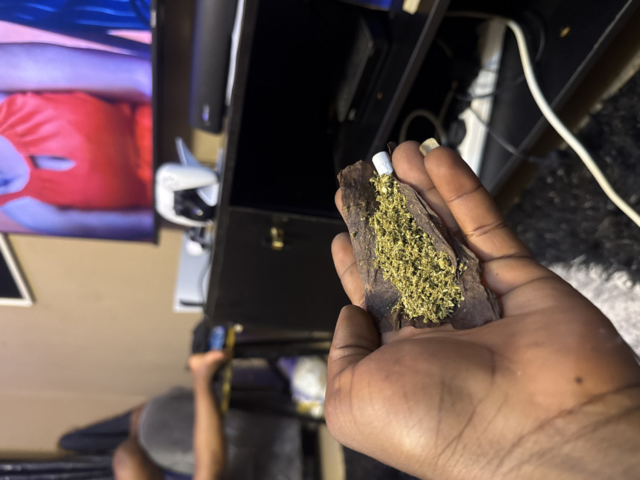 This image depicts an indoor residential setting in Lokoja, Nigeria. In the foreground, a dark-skinned hand holds a partially prepared blunt. The blunt consists of a dark brown wrapper filled with a green, finely ground leafy substance, with a white cylindrical filter inserted at one end. The hand's fingernails are clean and manicured. In the midground, blurred, another individual is partially visible on the left, seated. Only their arm and a portion of their leg are discernible, suggesting a casual, relaxed posture. The background features a black entertainment unit. On its surface, a white PlayStation 5 console stands upright next to a white PlayStation DualSense controller. To the right of these gaming peripherals, a black soundbar is positioned. Above the entertainment unit, a television screen displays content, with a prominent figure wearing a red top or dress visible. The room has light brown walls and a dark, textured floor, possibly a rug or carpet, partially visible in the bottom-right. Various cables are visible around the entertainment unit, indicating connected electronic devices.