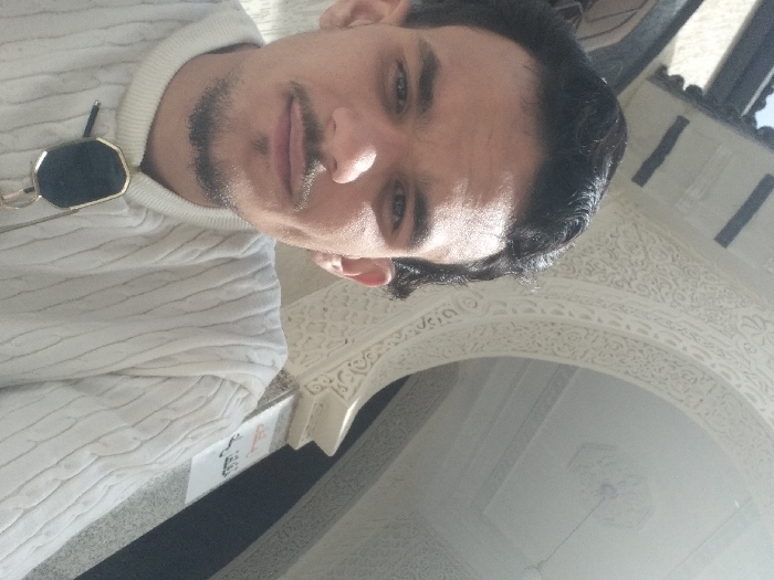 A young adult male is depicted in a selfie-style portrait, positioned slightly off-center to the left. He has dark hair, styled to the sides, and light stubble forming a mustache and chin beard. He is wearing a light-colored, possibly cream or off-white, cable-knit sweater with a ribbed crew neck. A pair of sunglasses with dark hexagonal lenses and a gold-colored frame is hanging from his neck on the sweater. The subject is looking directly at the camera with a slight smile. The background features ornate Islamic architecture characteristic of Morocco. A large, light-colored archway, intricately carved with geometric and floral arabesque patterns, dominates the right side of the frame. The arch and its supporting structures are made of stone or stucco, showcasing traditional Moroccan craftsmanship. A bright, light-colored ceiling with a central decorative element is visible through the arch. On the lower right, a pillar, likely of stone, supports the arch. A white rectangular sign with red Arabic script is affixed to this pillar; the visible text clearly includes "مكناس" (Meknes), confirming the location as the city of Meknes, Morocco. The scene is brightly illuminated, suggesting natural daylight.