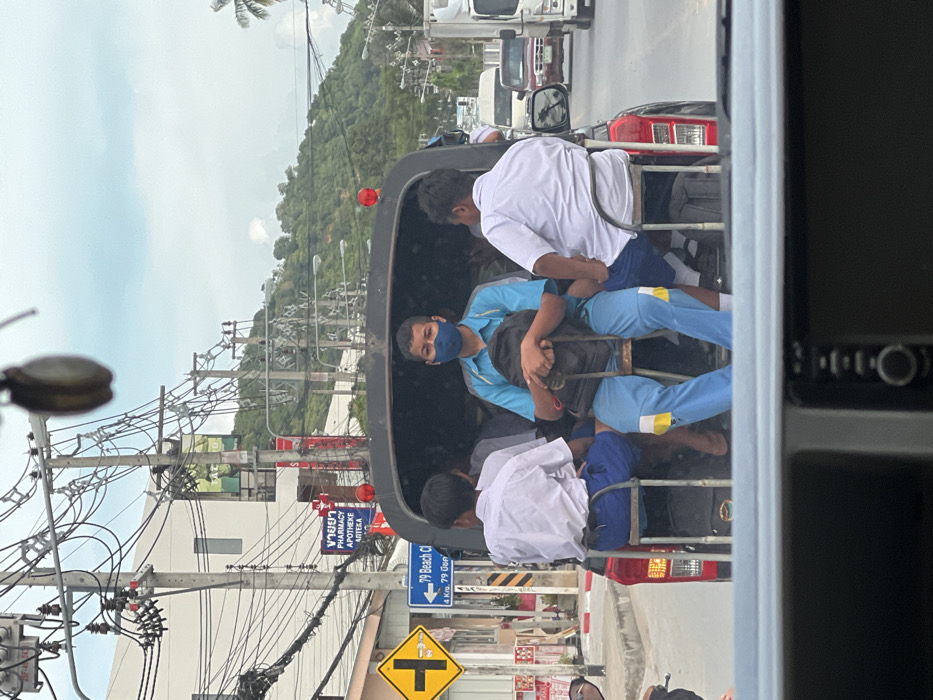 The image captures a daytime street scene in Baan Bo Phut, Thailand, viewed from inside a vehicle through its windshield. A blue road sign on the left confirms the location, displaying "→ 79 Beach Ch..." and "4 Km. 79 Bophut". In the midground, a dark-colored pickup truck, fitted with a rear canopy, is transporting at least five individuals in its bed. Three male passengers are clearly visible, seated on metal-framed benches facing forward. The central figure wears a light blue polo shirt, blue trousers with yellow and white striped patches, and a blue face mask, holding a black backpack with both hands and looking toward the camera. To his left and right, two other males, dressed in white short-sleeved shirts and blue shorts, are seated with their backs partially facing the camera. Red taillights are mounted on the upper rear corners of the truck canopy. The left background shows a yellow triangular road sign indicating a merge or T-junction. A multi-story, light-colored building features a sign for a "PHARMACY APOTHEKE APTEKA" in Thai, English, and German. Overhead, numerous utility poles are densely strung with power and communication lines. The right background reveals a paved street extending into the distance with other vehicles, including a white van and a light-colored truck. A large, lush green, forested hill dominates the far background under an overcast sky.