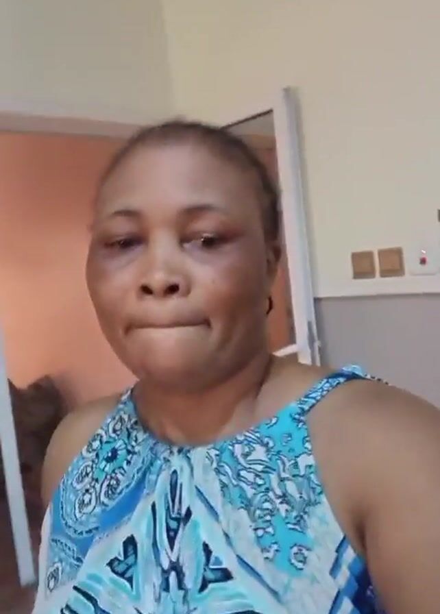 A woman is recording a video of herself indoors. The woman is facing the camera. She has brown skin and wears a blue sleeveless top with a geometric pattern. Her hair is pulled back. She appears to be in a room with a door and possibly a window in the background. The room has neutral-colored walls. The woman smiles and maintains eye contact with the camera.